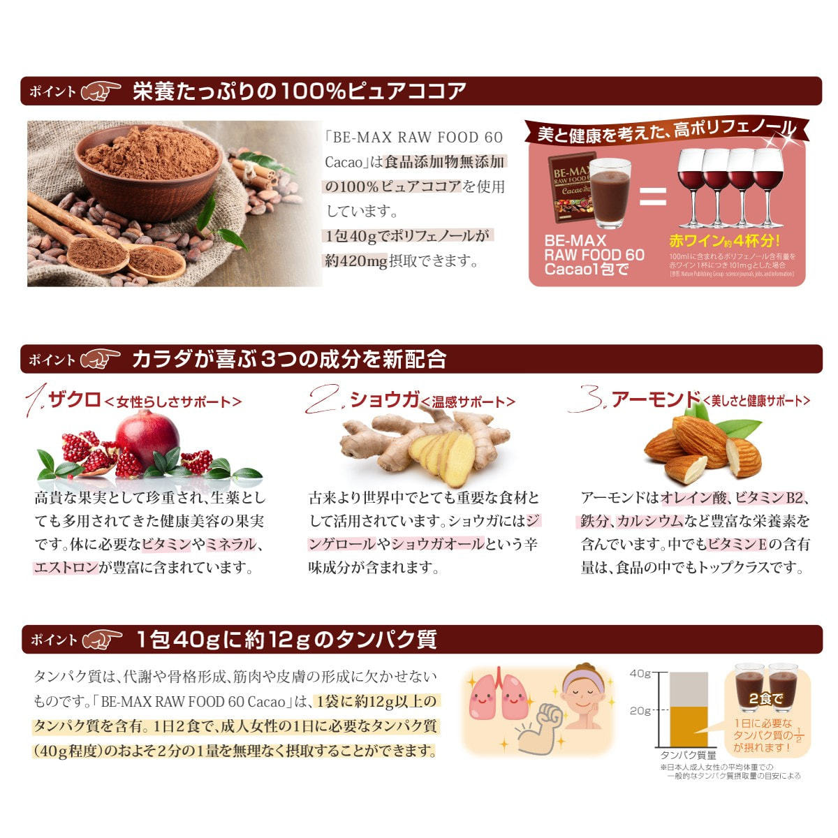 「BE-MAX RAW FOOD 60Cacao」は野菜・穀物・果物などを、皮・葉・種ごと凍結乾燥させ粉末にしたものです。